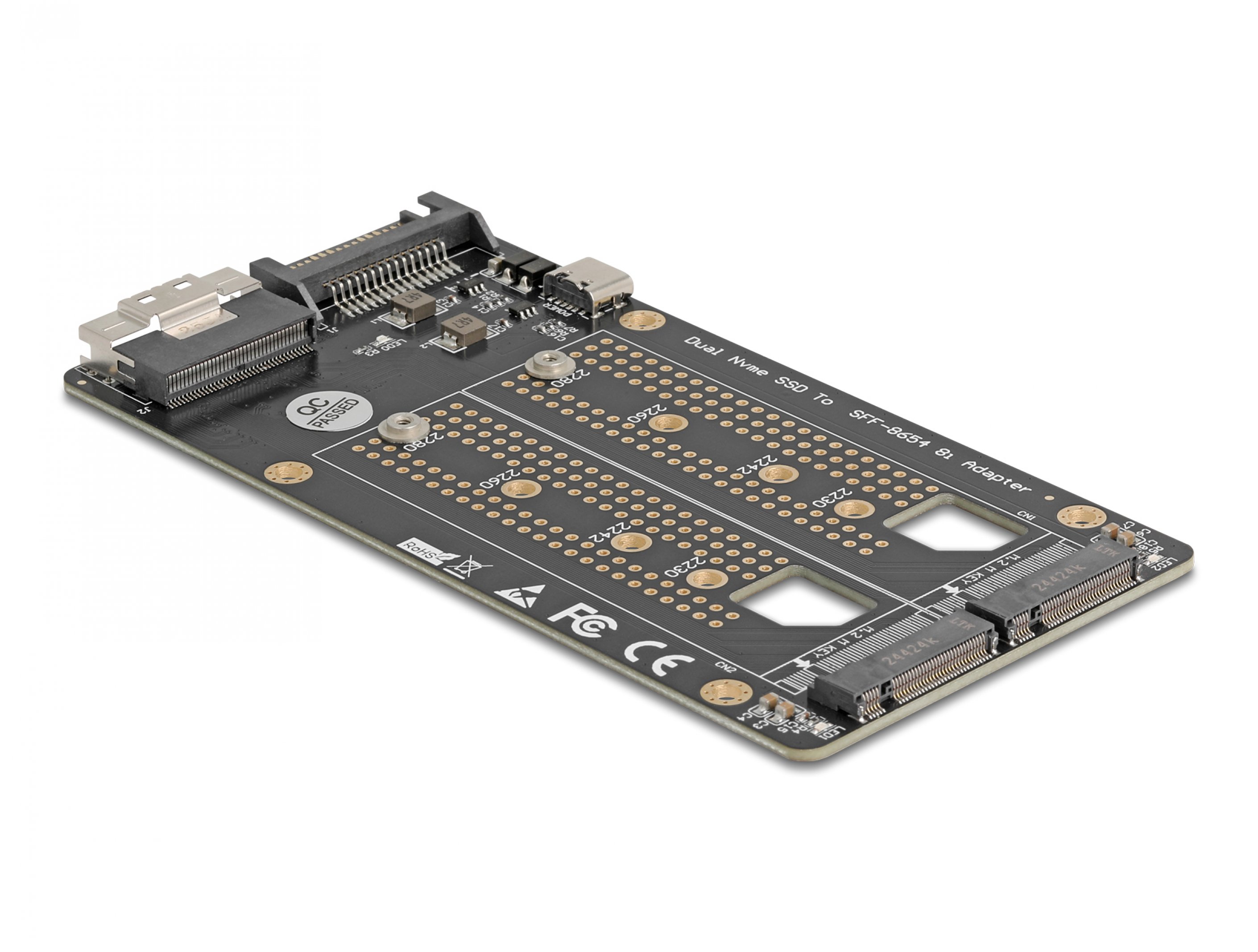 Acest convertor de la Delock permite conectarea a doua SSD-uri M.2 in format 2280, 2260, 2242 si 2230 cu key M si functionarea lor simultana. Convertorul poate fi instalat in sistem prin interfata SFF-8654 8i.