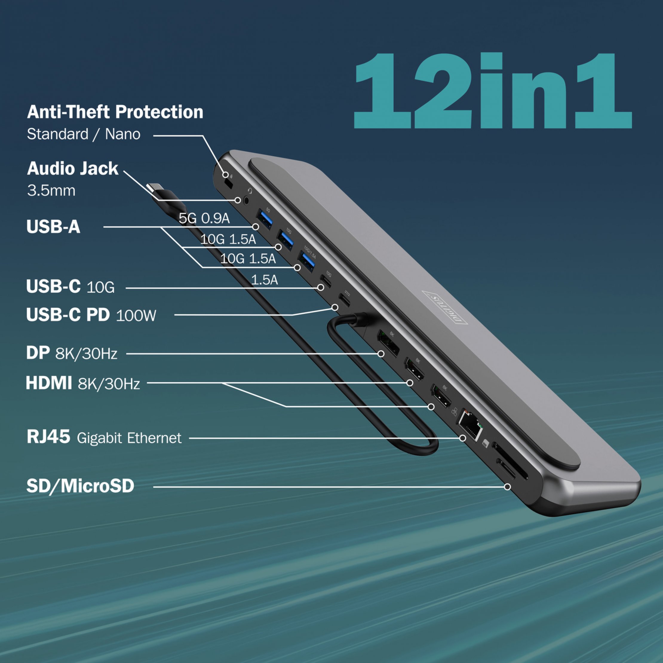 Statie de andocare USB-C 8K, 12 porturi, 2x HDMI, 1x DP, 3x USB-A, 1x USB-C, 1x RJ45, 1x PD
