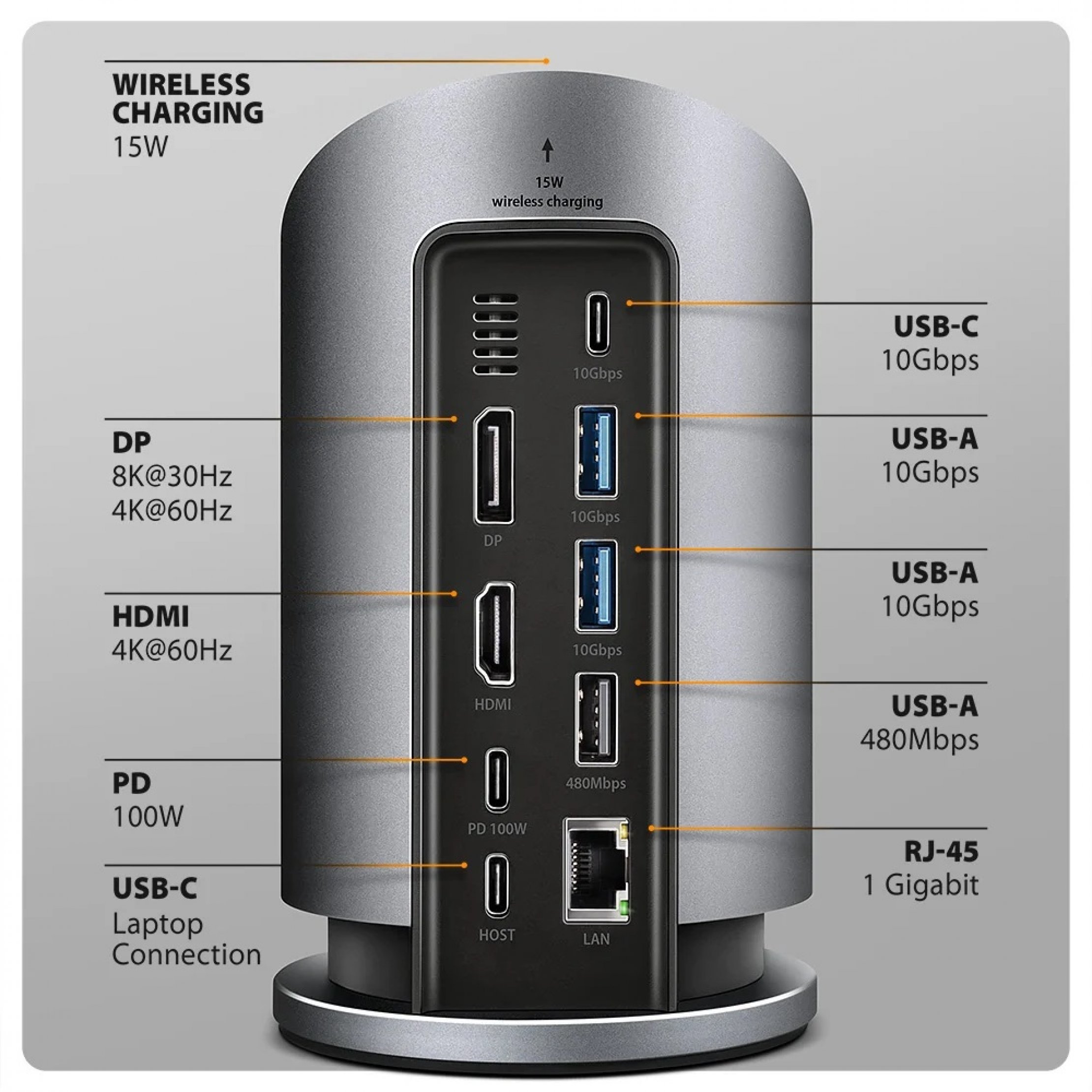 Hubul USB-C multi-port 10Gbps AXAGON HMC-WL9 WIRELESS CHARGING 9in1 extinde laptopul, calculatorul sau telefonul cu doua iesiri video, un conector LAN, porturi USB si un incarcator wireless. Laptopul se conecteaza la hub printr-un cablu USB-C de 60 cm. Astfel obtii acces imediat la conectivitate pentru doua monitoare 4K, patru dispozitive USB si un conector RJ-45 pentru retea Gigabit Ethernet. In acelasi timp, ai posibilitatea de a alimenta notebook-ul folosind tehnologia Power Delivery. Datorita compatibilitatii cu Thunderbolt 3/4/5, statia de andocare 9in1 functioneaza cu laptopuri precum Apple MacBook Air sau MacBook Pro.