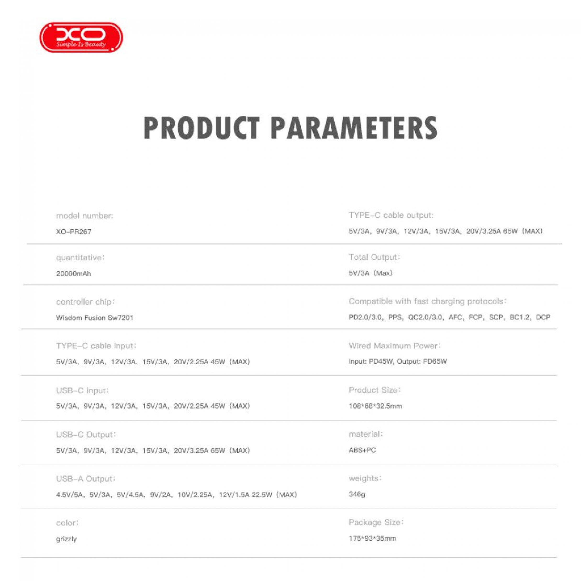 Descriere Power bank 20000 mAh 65W cu display + cablu USB-C Gri, XO PR267