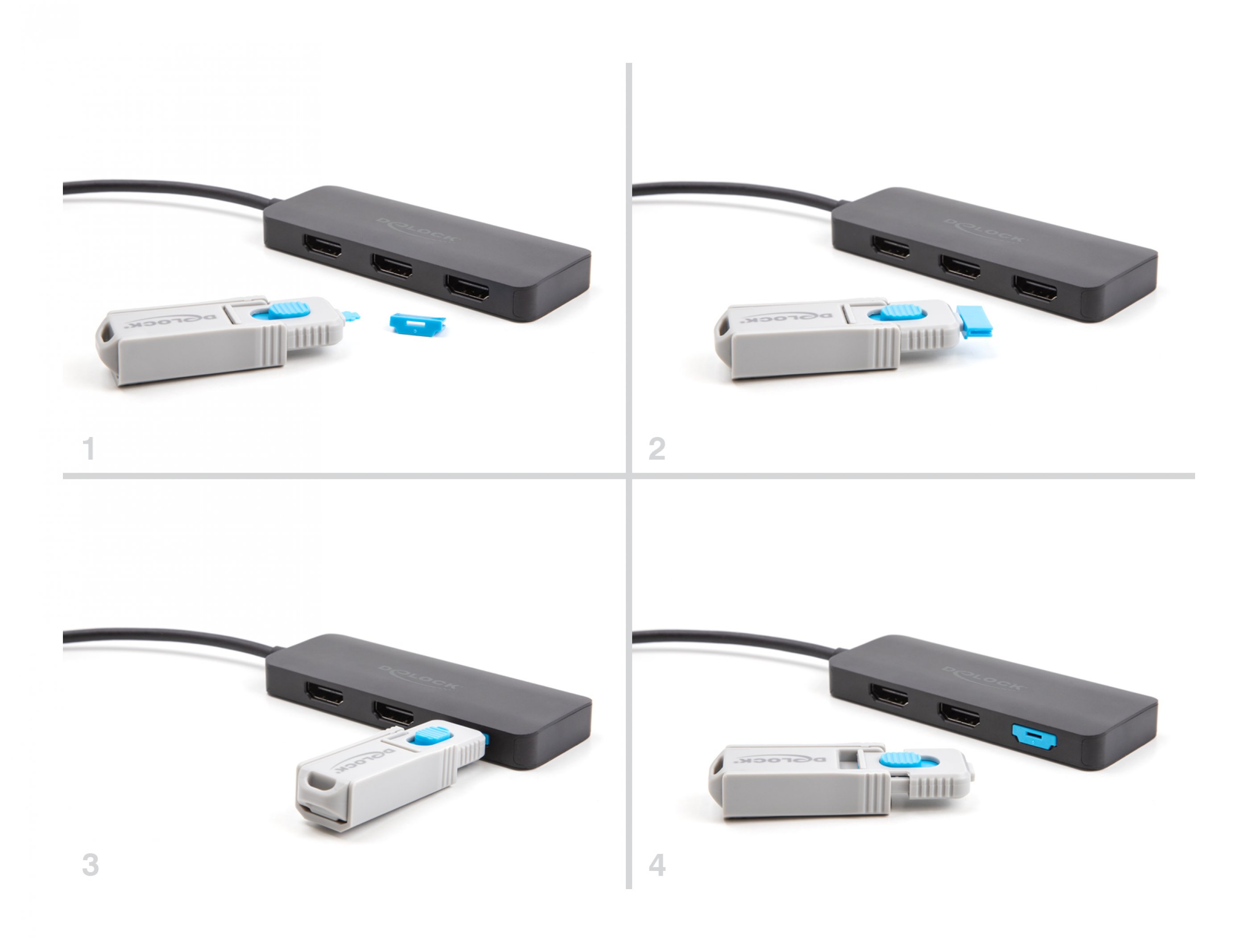 Acest set de blocare porturi de la Delock este un accesoriu pentru 20923. Un total de 10 porturi HDMI pot fi blocate cu acest set. Accesul cablurilor la porturi nu mai este posibil.