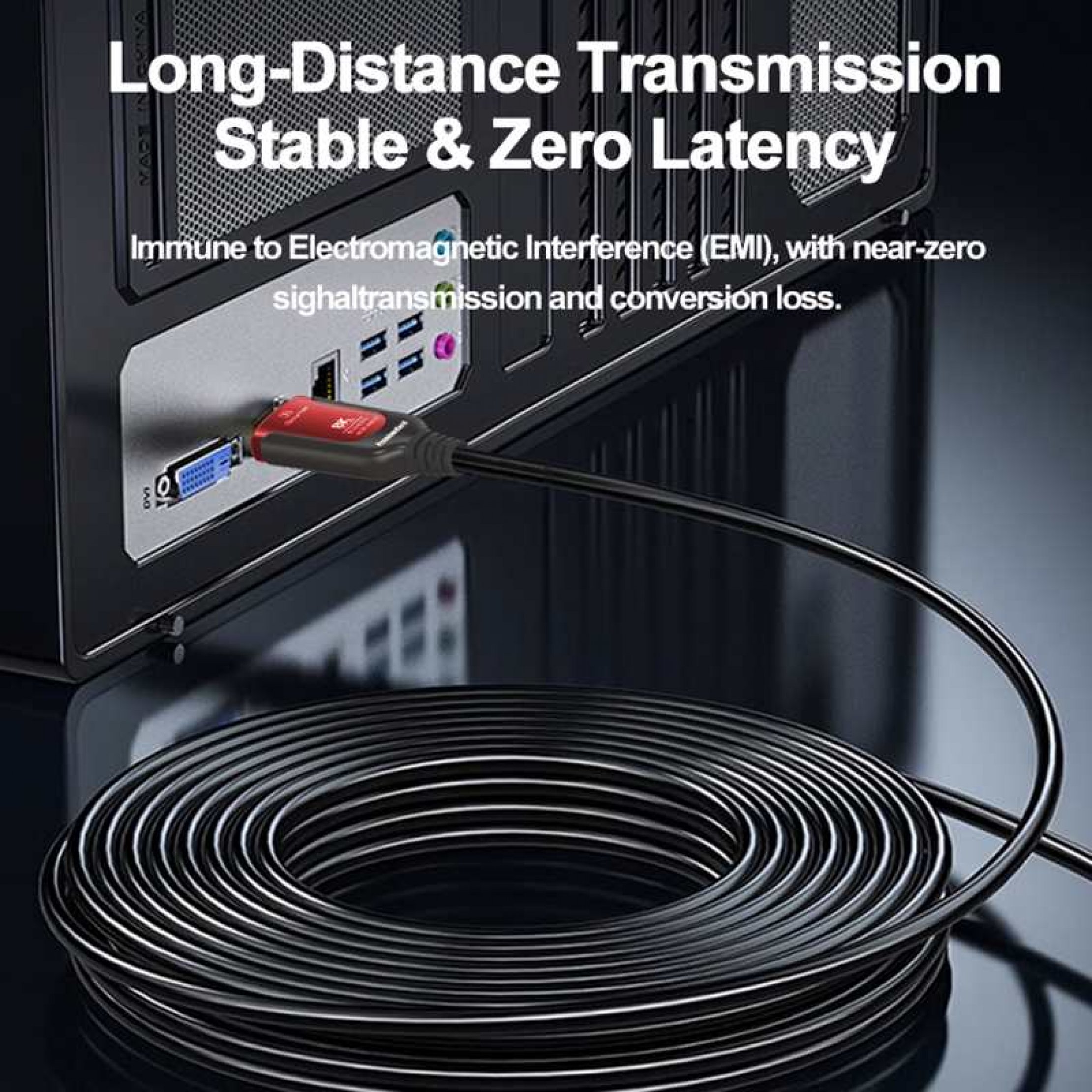 Cablul optic AOC este caracterizat prin transmitere excelenta a semnalului pe distante lungi fara pierderi, este rezistent la interferente electromagnetice si ofera cea mai buna calitate a imaginii comparativ cu cablurile metalice