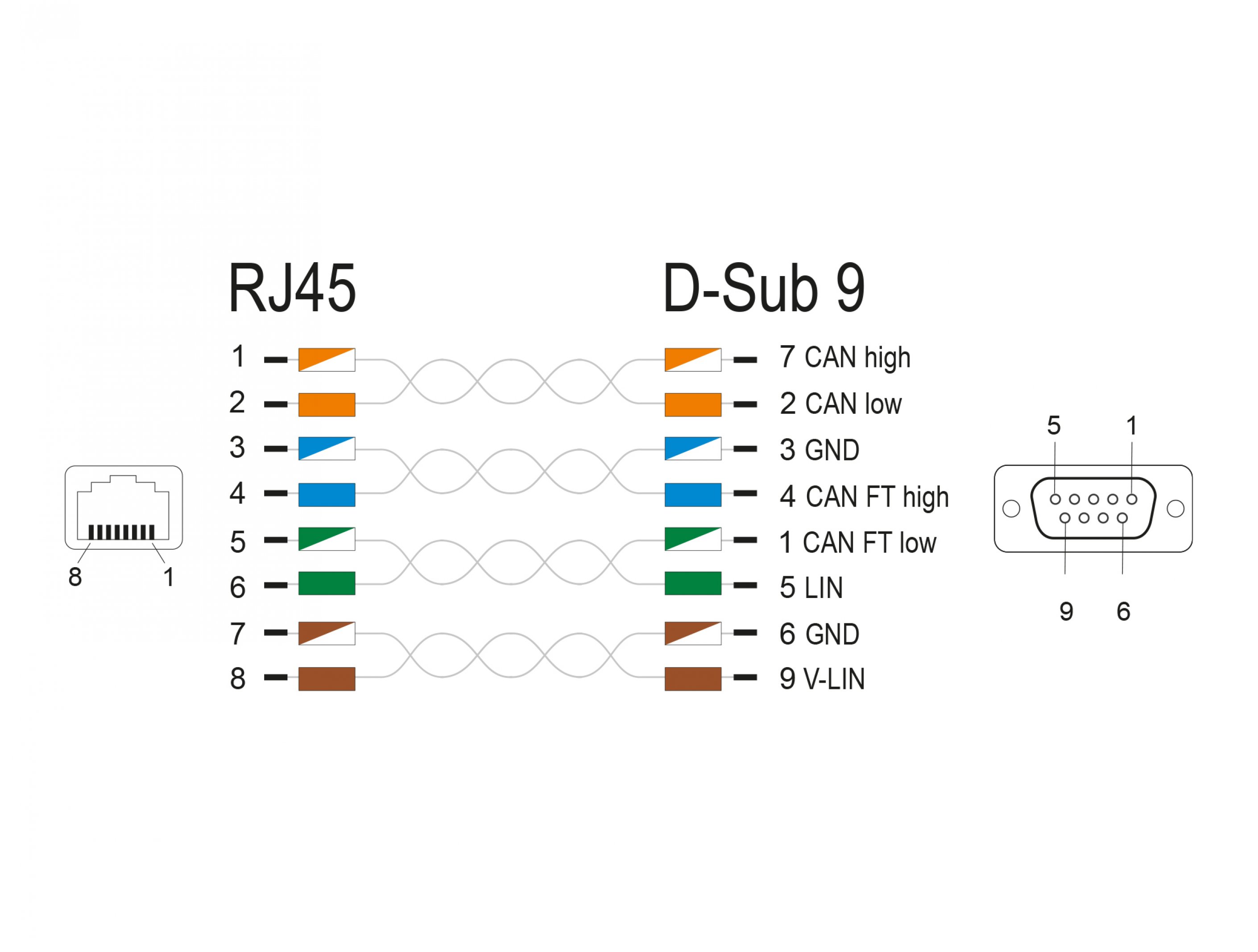 1 x RJ45: CAN high(1), CAN low(2), GND(3), CAN high FT(4), CAN low FT(5), LIN(6), GND(7), V-LIN(8)