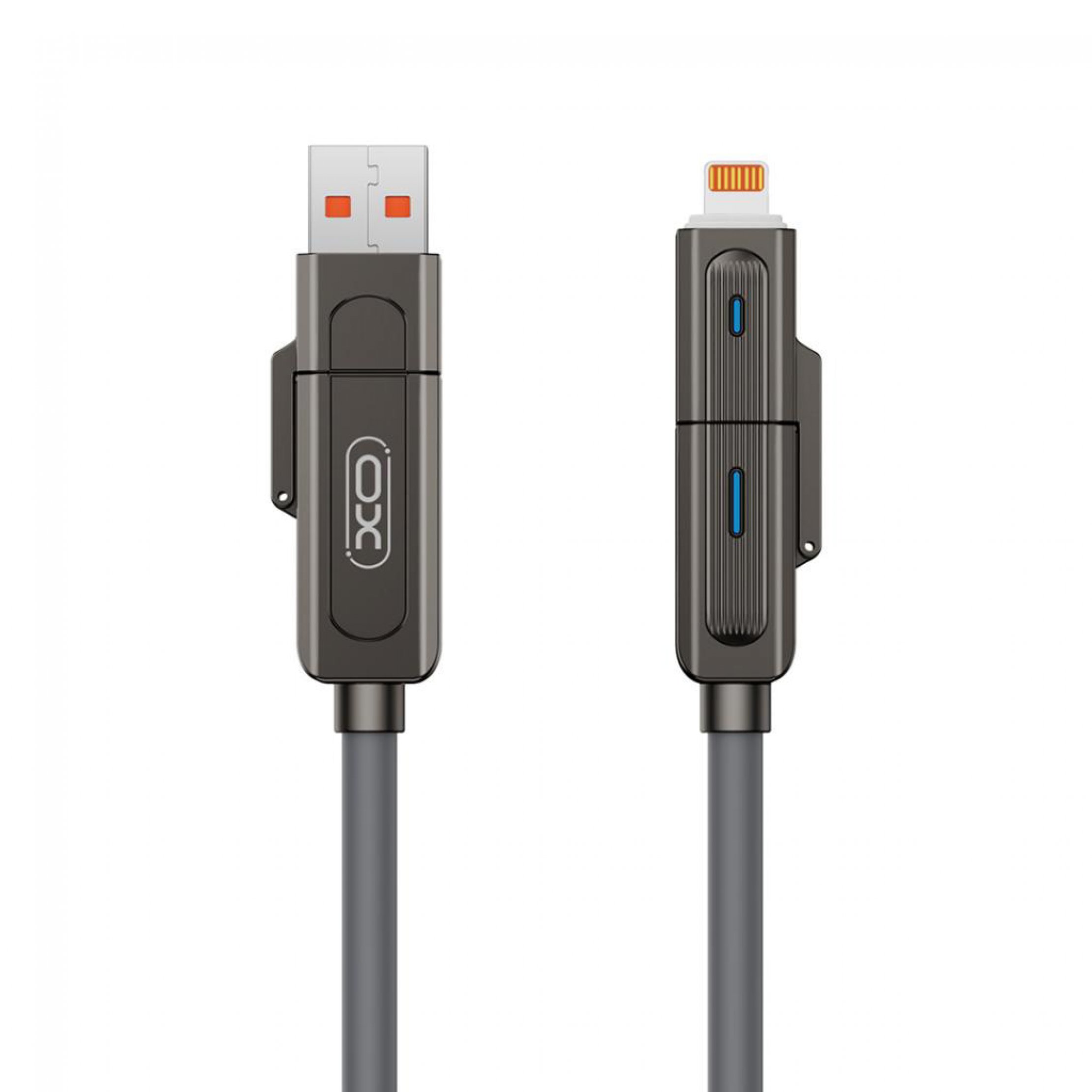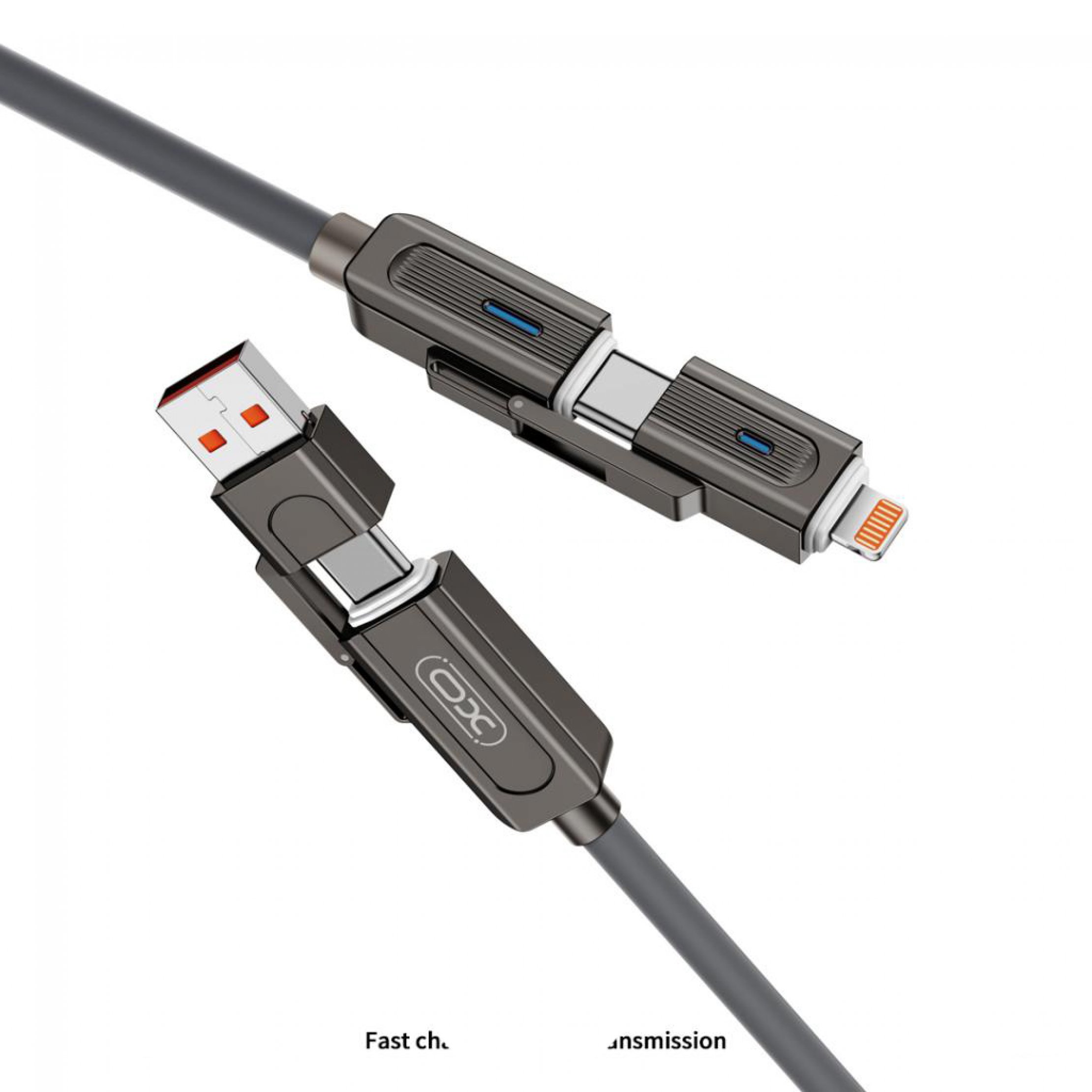 Cablu 4-in-1 care include 4 conectori diferiti - 2 conectori Type-C, 1 USB-A si 1 Lightning.