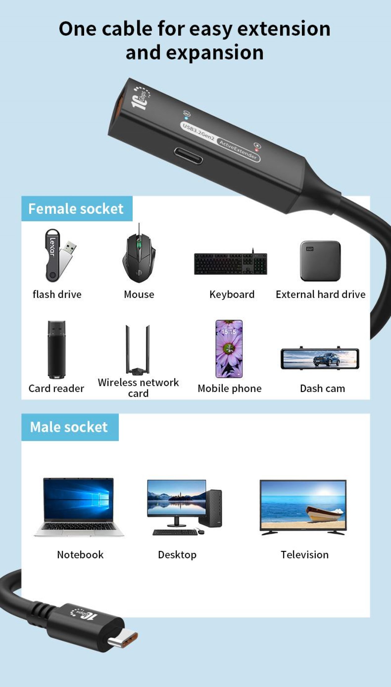 Cablul are un amplificator activ integrat si este potrivit pentru extinderea unui cablu USB 3.2 Gen2 cu inca 7 m, pentru o viteza maxima de 10 Gbps.
