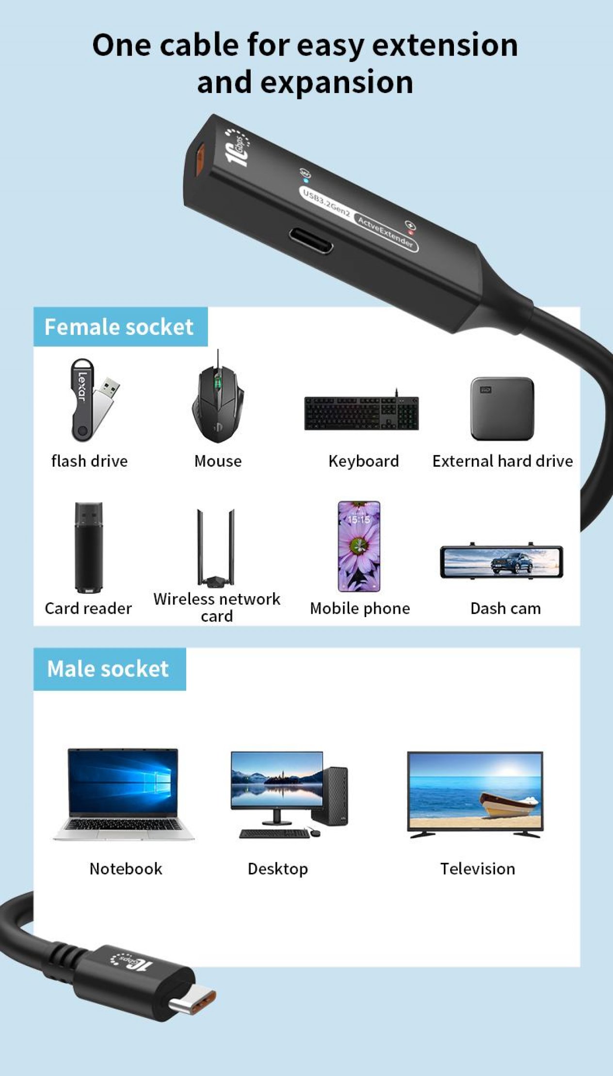 Cablul are un amplificator activ integrat si este potrivit pentru extinderea unui cablu USB 3.2 Gen2 cu inca 10m, pentru o viteza maxima de 10 Gbps.