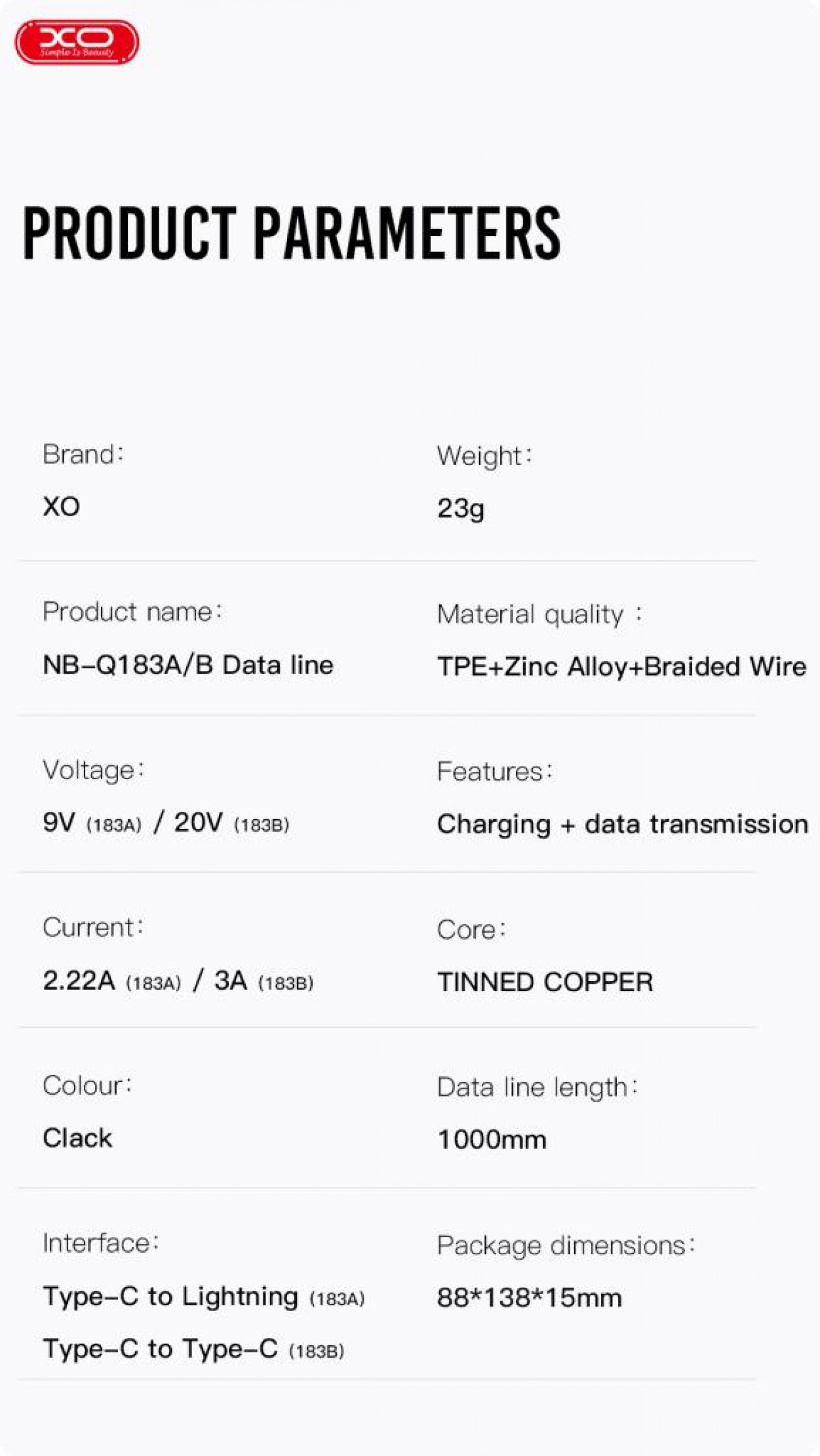 Specificatii tehnice Cablu USB 2.0 type C la USB type C 60W 1m brodat Negru, XO NB-183B