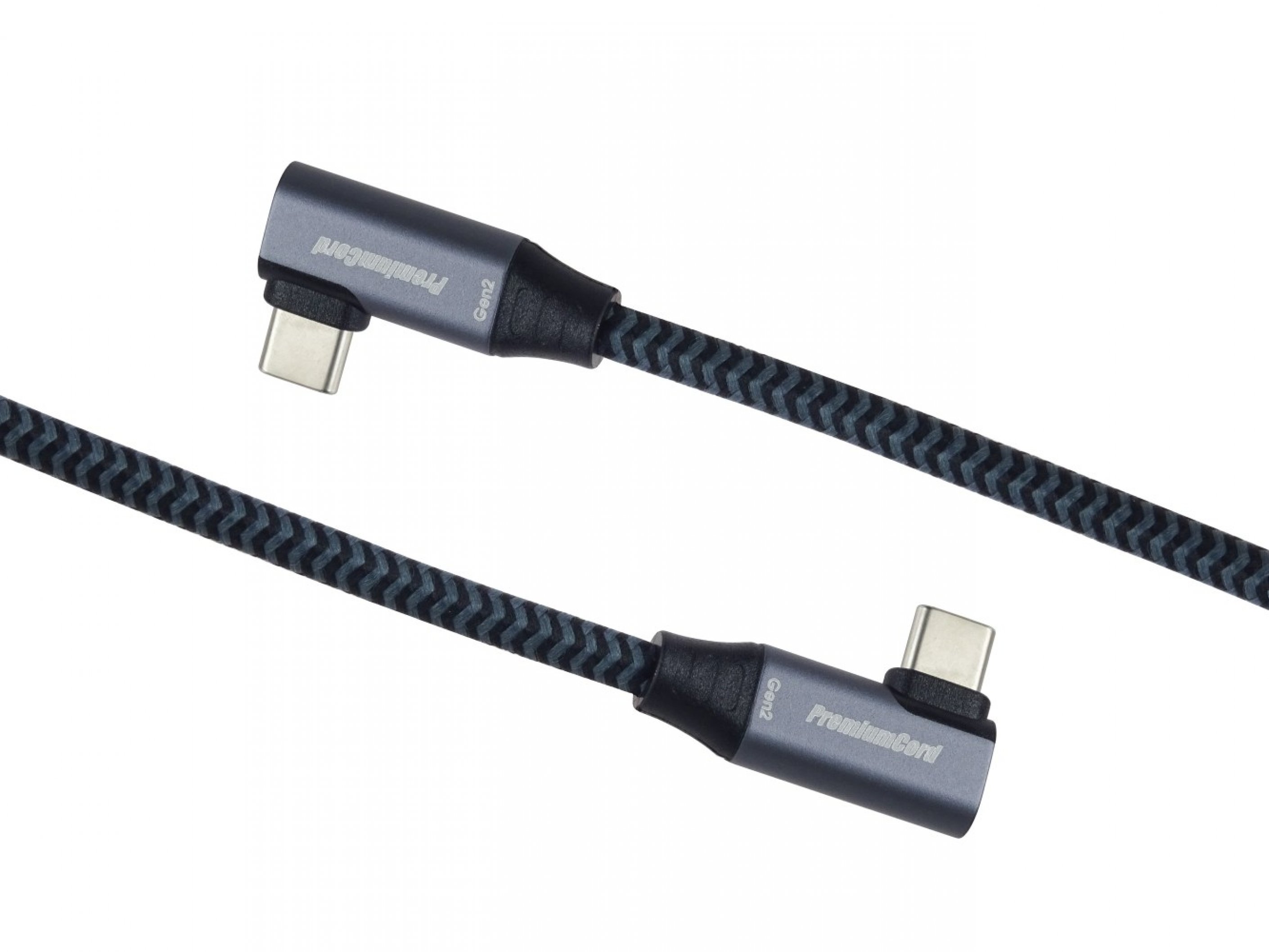 Cablu USB-C cu ambele capete unghi de 90° (USB 3.2 GEN 2x2, 5A, 100W, 20 Gbit/s), mufe din aluminiu, impletitura textila din bumbac, 1m