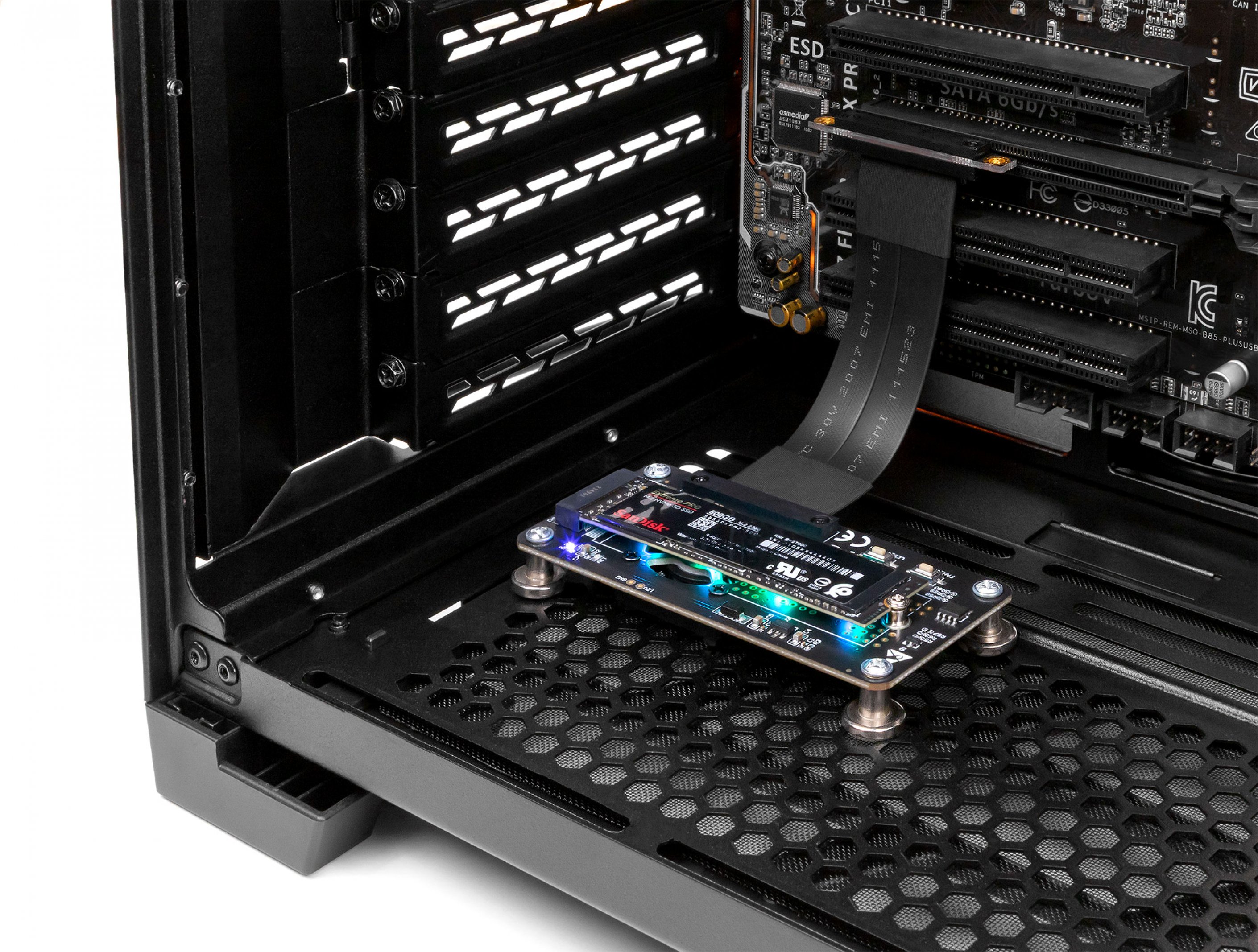 Adaptorul este prevazut cu un ventilator integrat, cu zgomot redus, care raceste activ SSD-ul, asigurand performanta stabila chiar si in timpul operatiunilor prelungite sau intensive din punct de vedere al transferului de date. In plus, iluminarea LED RGB integrata ofera un efect vizual atractiv, cu tranzitie automata a culorilor, ideala pentru configuratii de test deschise sau medii de modding.