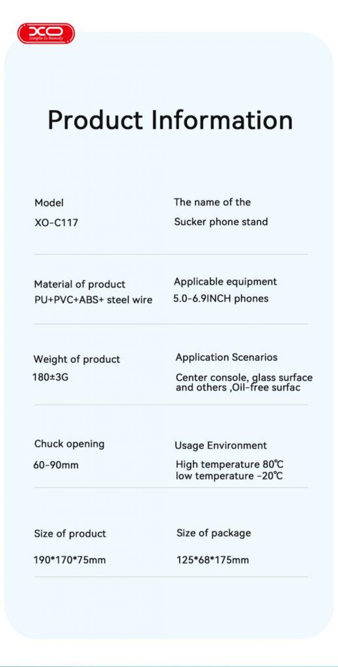 Specificatii tehnice Suport auto cu ventuza pentru 2 x smartphone, XO C117