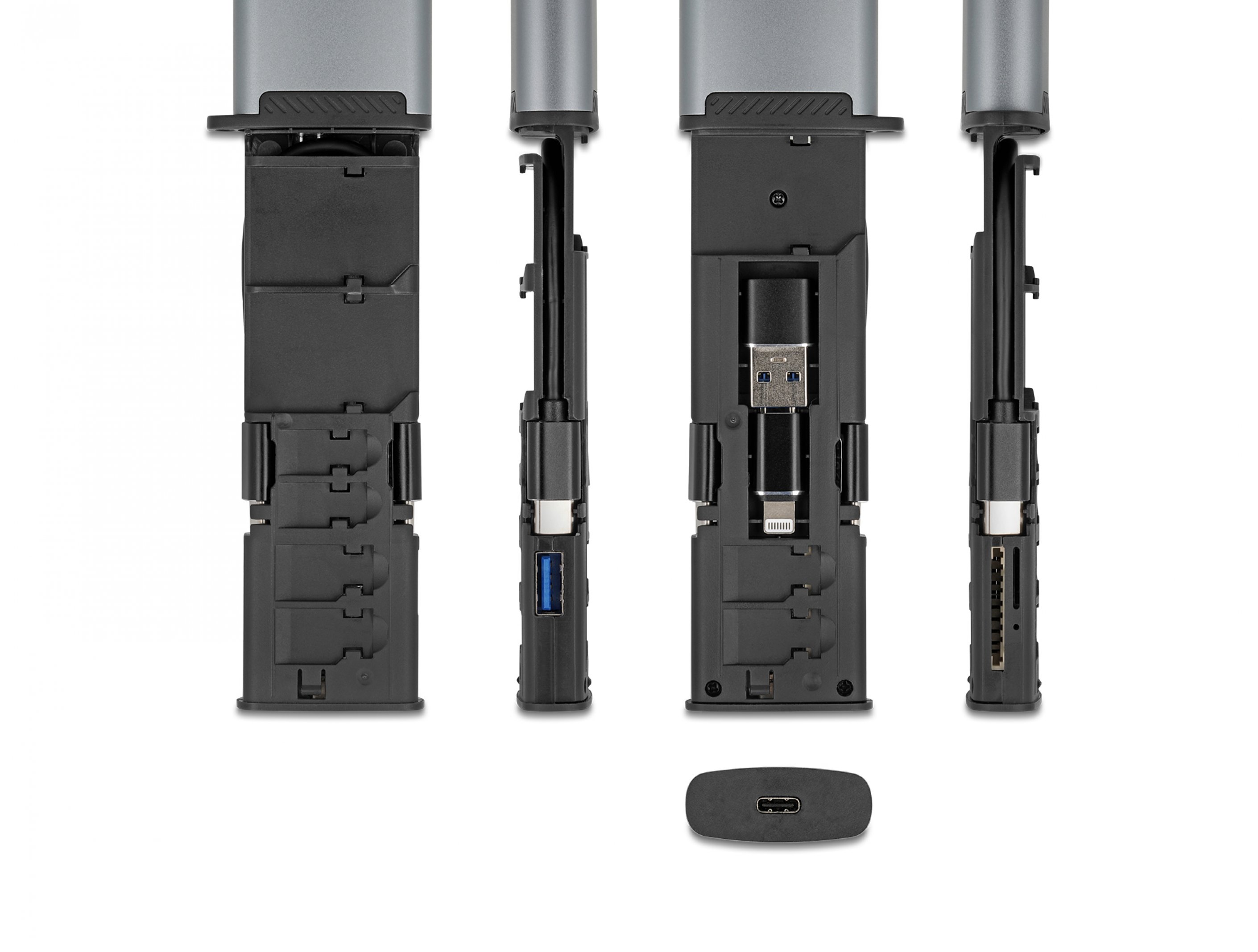 Pe langa functia de cititor de carduri, dispozitivul serveste si ca solutie de stocare sigura si compacta pentru pana la 9 carduri simultan. Carduri SD, Micro SD si Nano SIM pot fi pastrate direct in dispozitiv, mentinand mediile de stocare esentiale bine organizate si usor accesibile – ideal pentru utilizare mobila sau ca solutie de rezerva in deplasare.