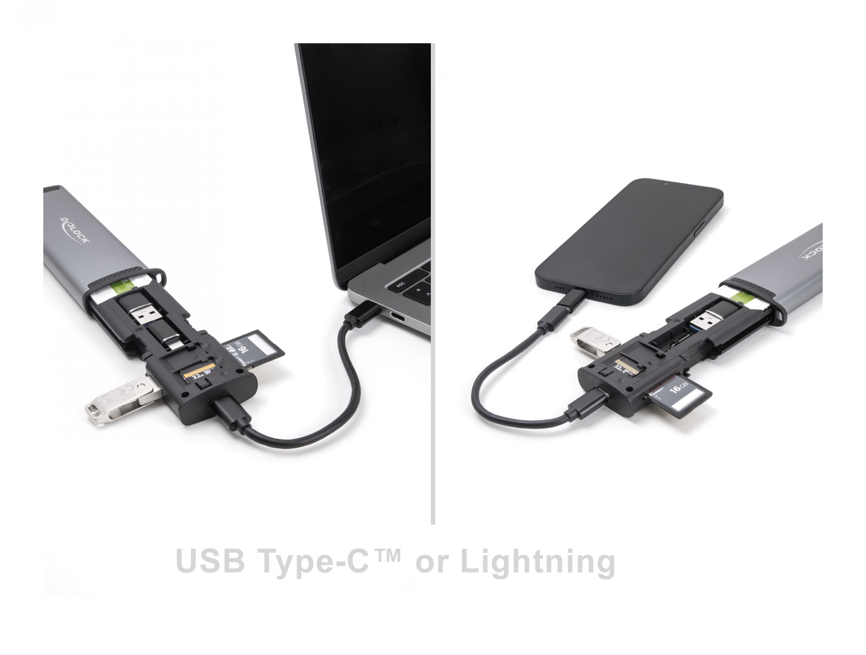 Cititorul de carduri de la Delock are doua sloturi pentru carduri de memorie si permite citirea si scrierea diferitelor carduri SD si Micro SD. Cititorul poate fi conectat la un calculator sau la un dispozitiv mobil prin intermediul interfetei USB tip C™, Lightning sau USB tip A.