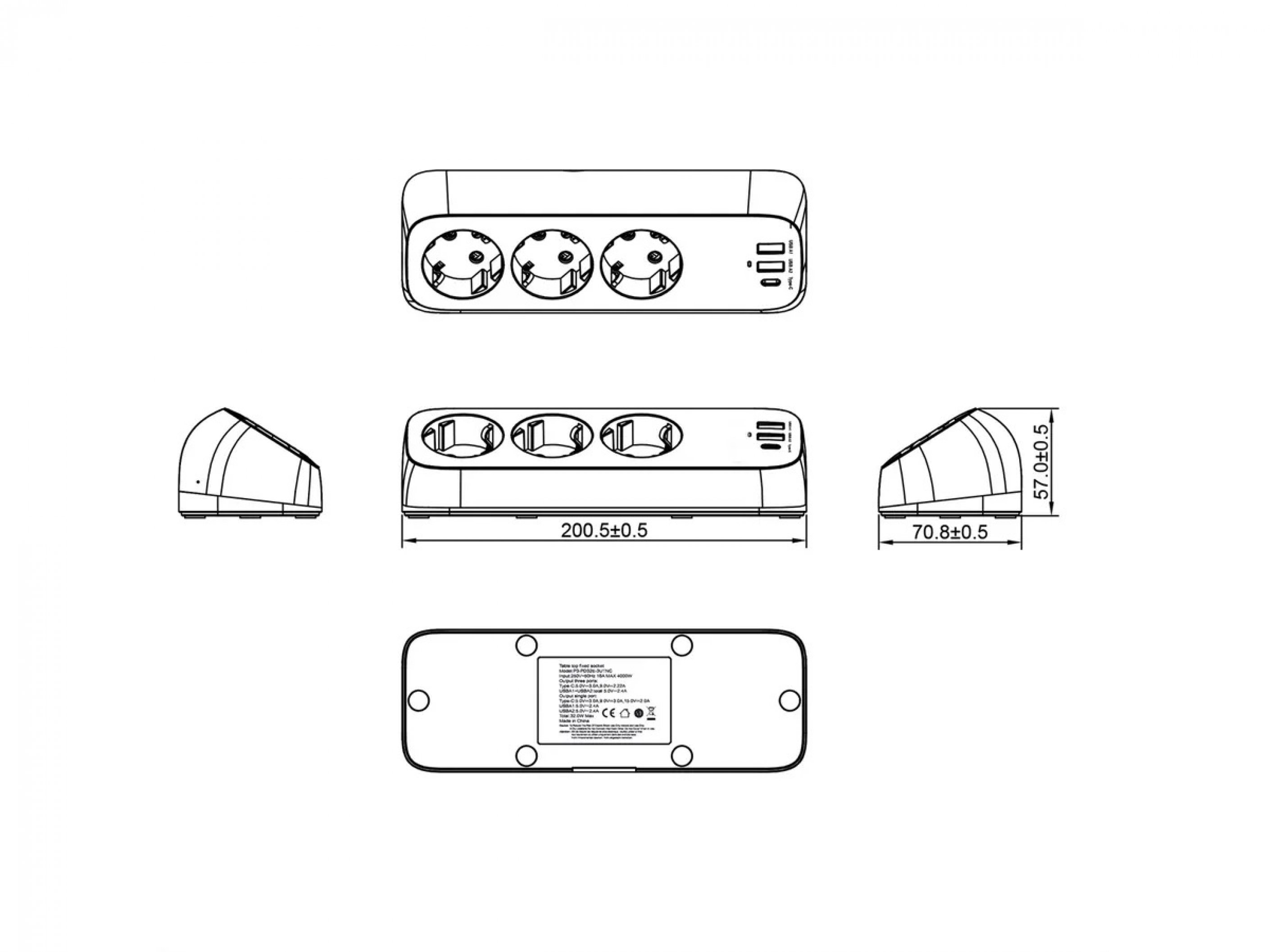 Prelungitor cu 3 prize, carcasa din plastic, echipat cu 3x prize tip german (CEE 7/3) si 3x porturi USB pentru incarcare (1x USB-C si 2x USB-A) si clema pentru masa.