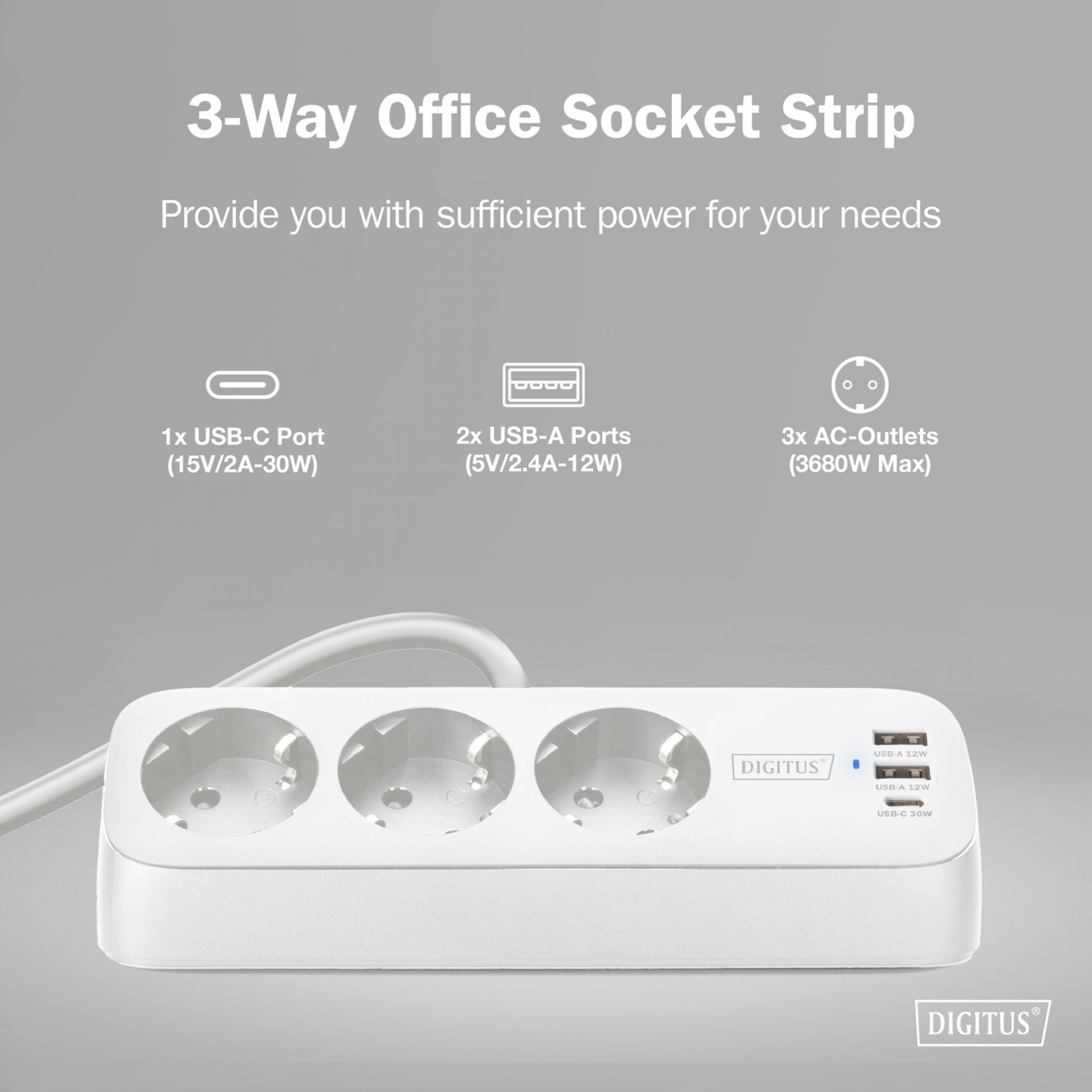 Caracteristici generale Prelungitor cu 3 x Schuko + 2 x USB-A + 1 x USB-C cu montare birou Alb 1.5m, Digitus DA-70626