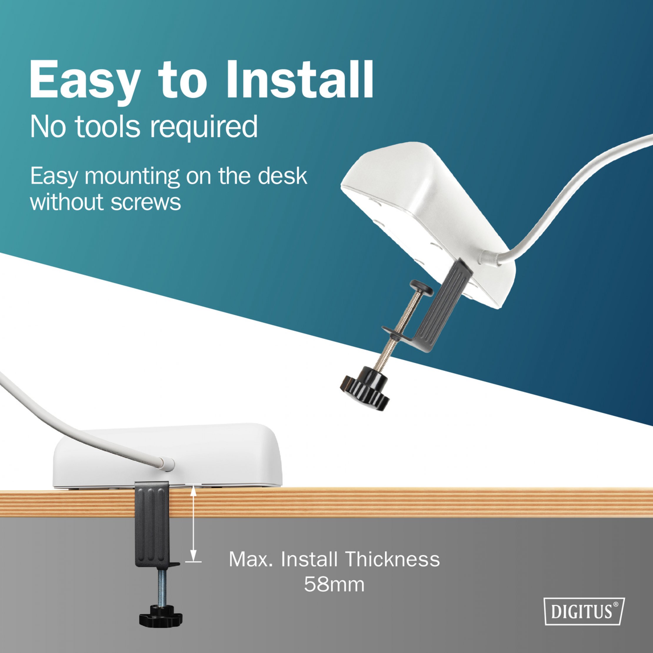Descriere Prelungitor cu 3 x Schuko + 2 x USB-A + 1 x USB-C cu montare birou Alb 1.5m, Digitus DA-70626