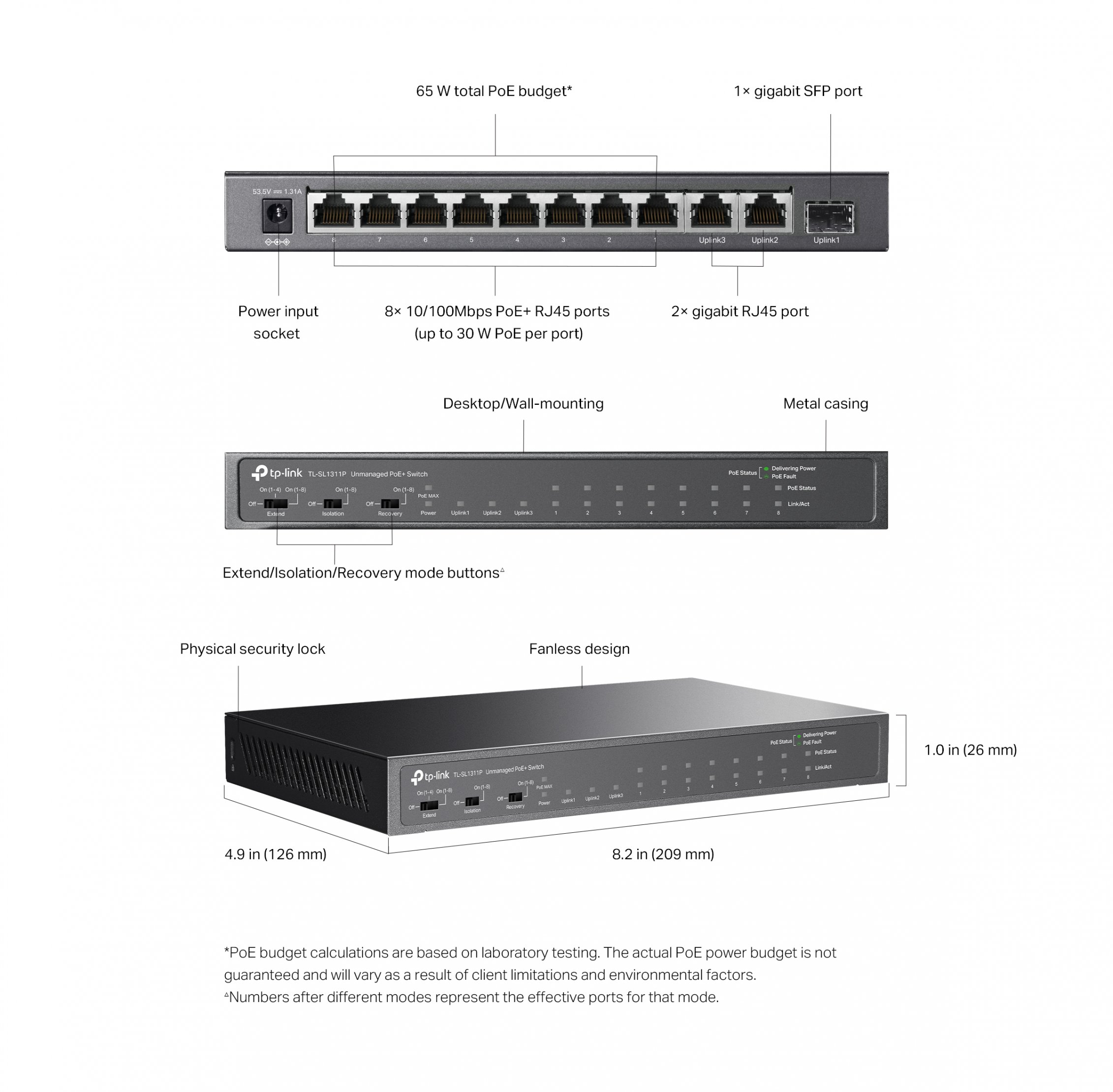 Specificatii tehnice Switch 8 x 10/100Mbps + 2 x Gigabit + 1 x SPF Gigabit (din care 8 x PoE+), TP-LINK TL-SL1311P