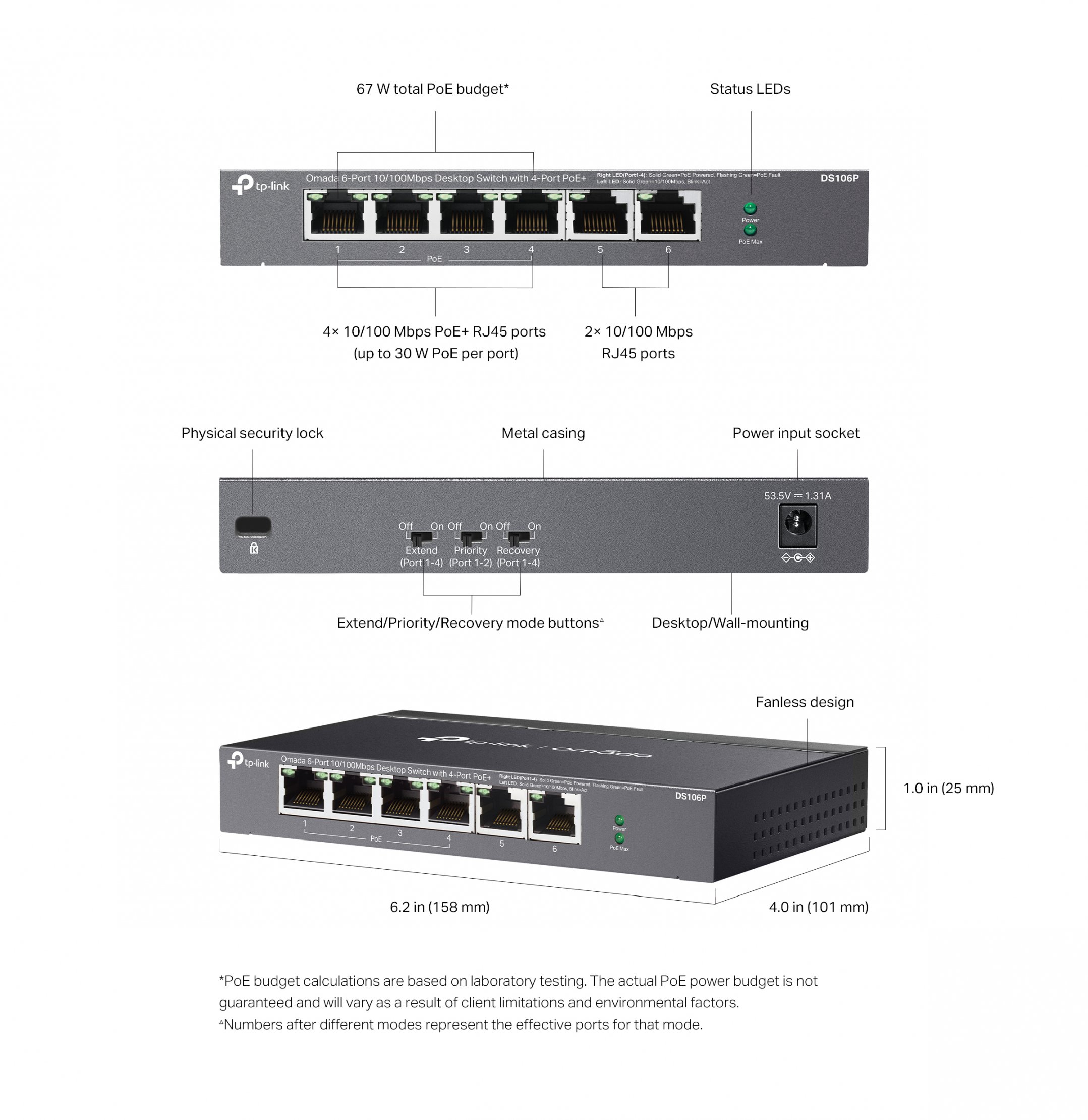 Specificatii tehnice Switch Desktop 6 porturi 10/100Mbps (din care 4 x PoE+), TP-LINK DS106P