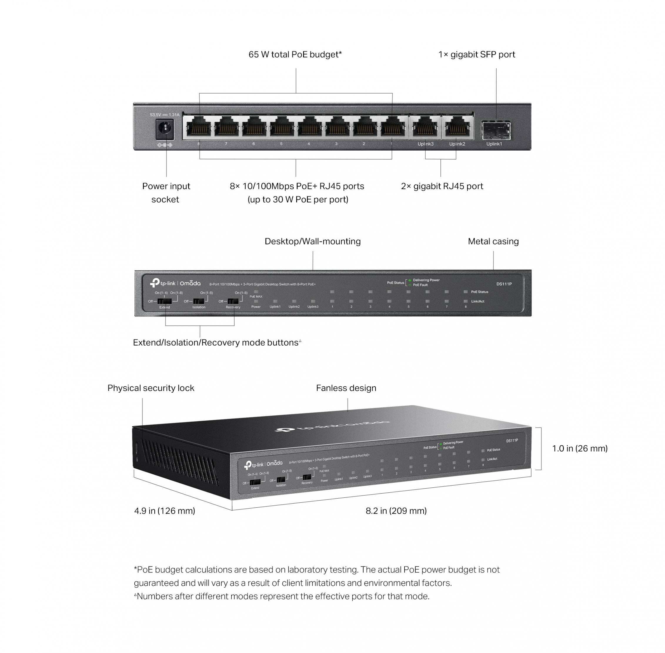 Specificatii tehnice Switch Omada 8 x 10/100Mbps + 2 x Gigabit Unmanaged + 1 x Gigabit SFP (din care 8 x PoE+), TP-LINK DS111P